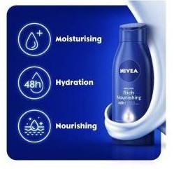 NIVEA Rich Nourishing body lotion is infused with the NIVEA DEEP MOISTURE SERUM, natural almond oil and vitamin E. The patented NIVEA formula uses the knowledge, that our skin contains sufficient moisture in its deeper layers. The unique composition of skin’s own moisturizer, moisture-locking lipids and care providing oils bind and hold water in the skin thus the moisture cannot evaporate easily into the surrounding area.