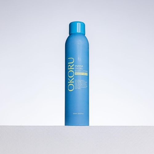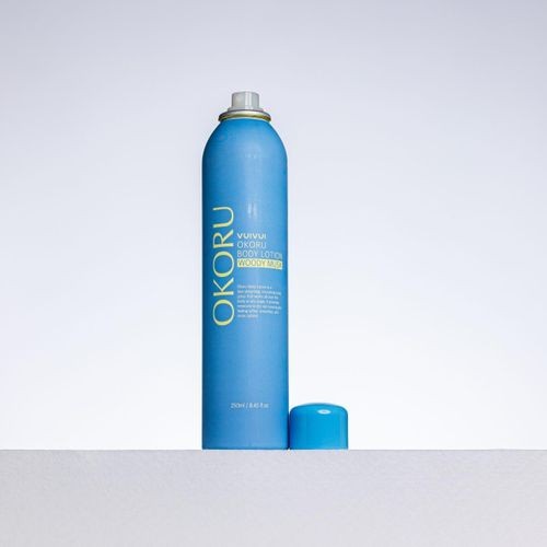 A spray-type body lotion that can be easily applied to areas such as the back or legs where