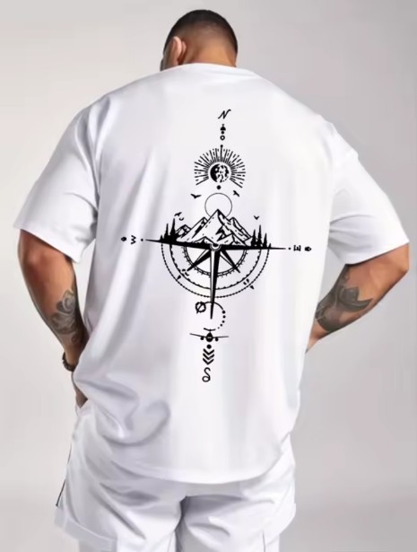 Summer men's 100% pure cotton casual sports loose oversized retro compass printed comfortable round neck short sleeved T-shirt